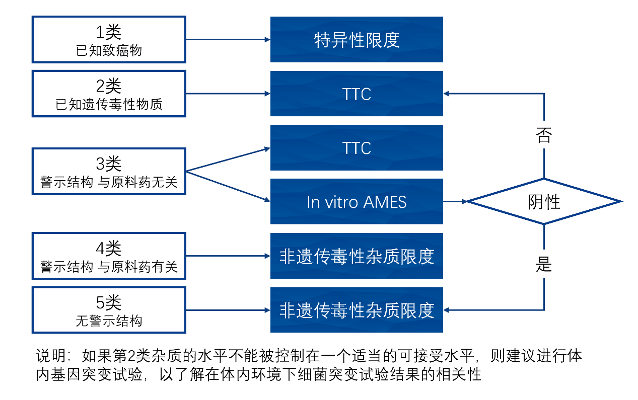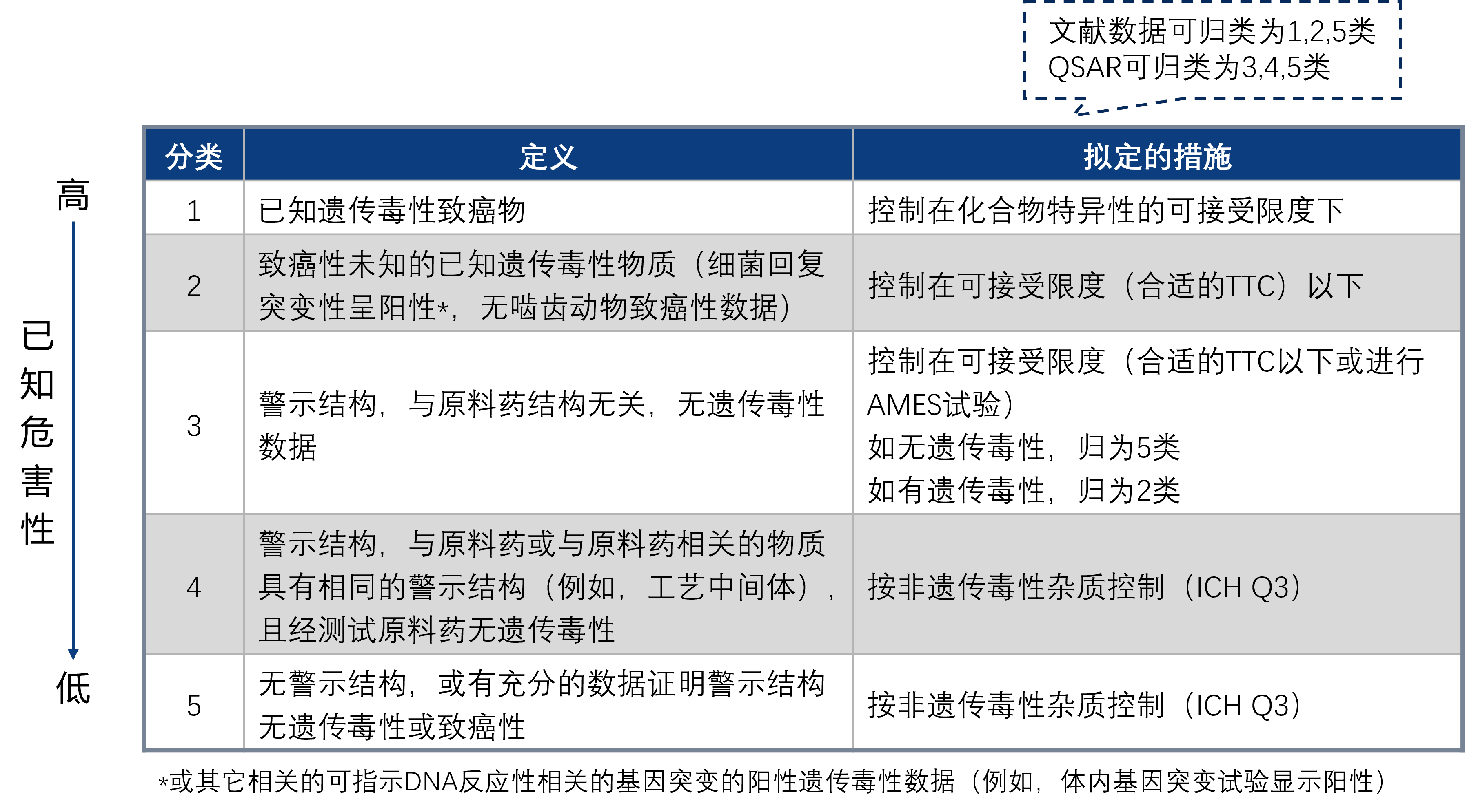 根據文獻數據庫或者QSAR計算所得出的危害評估的結果,可將雜質分為5個類別,詳細分類見下表。