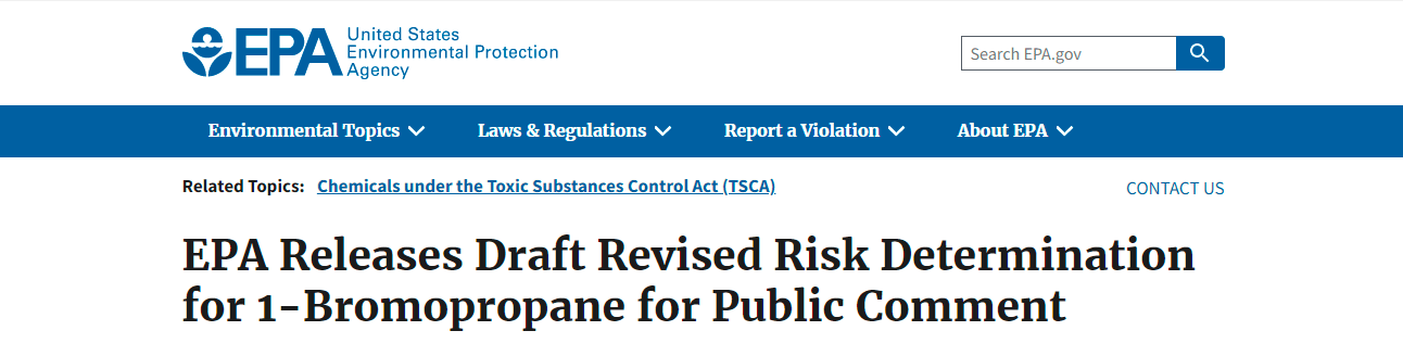 2022年7月20日,據美國有毒物質控制法案(TSCA)第6(b)條,美國環境保護署(EPA)發布1-溴丙烷風險評估修訂草案,以征詢公眾意見。修訂后的風險評估草案指出,1-溴丙烷存在使用條件下對人類健康造成不合理傷害風險。