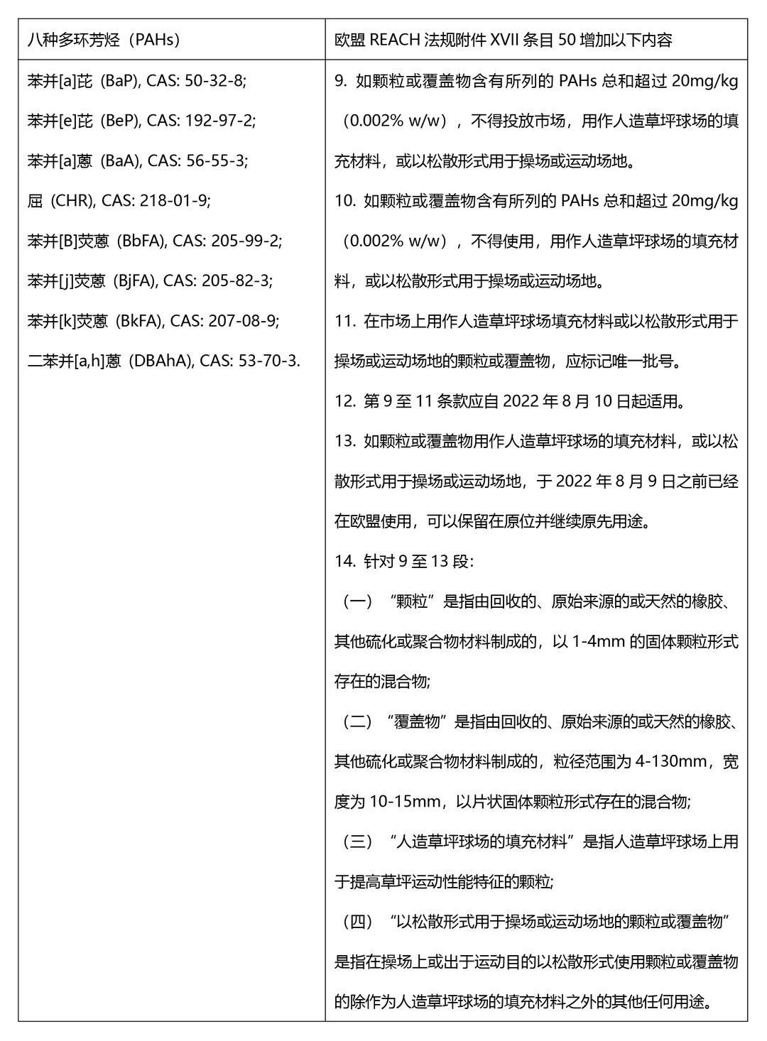 從2022年8月10日起,用作運動場、操場填充物的橡膠顆粒和覆蓋物中的八種多環芳烴(PAHs),濃度限值降至20mg/kg。