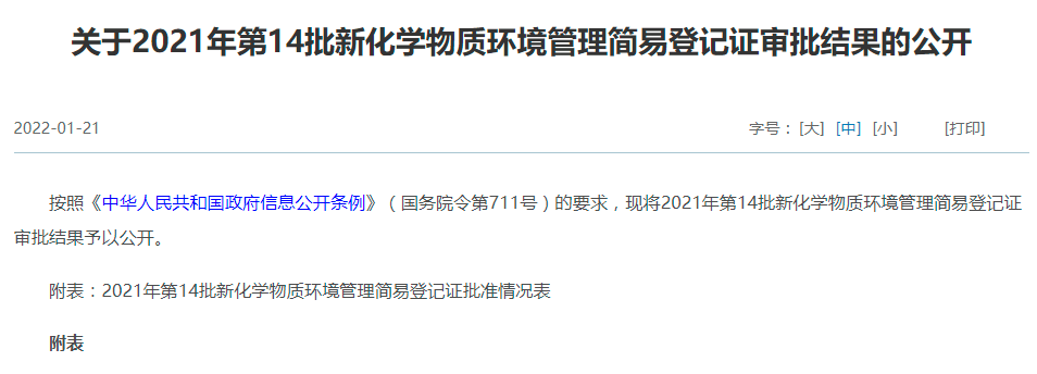 2022年1月21日,生態(tài)環(huán)境部發(fā)布了2021年第14批新化學物質(zhì)環(huán)境管理登記證審批結(jié)果,杭州以勒又完成了一例新化學物質(zhì)登記,協(xié)助企業(yè)取得了新化學物質(zhì)環(huán)境管理登記證。