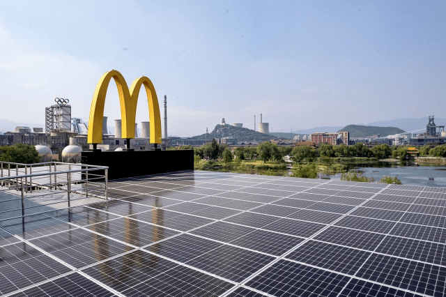 麥當勞首鋼園餐廳“零碳模式”最大的亮點是超過2000平方米的場地內太陽能光伏發電系統,年發電量可達約33萬度,滿足餐廳日常運營電力需求,每年減少碳排放約200噸。
