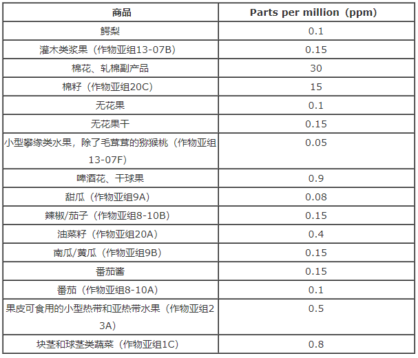 美國環保署就其毒理性、飲食暴露量以及對嬰幼兒的影響等方面進行了風險評估,最終得出結論認為,以下殘留限量是安全的。