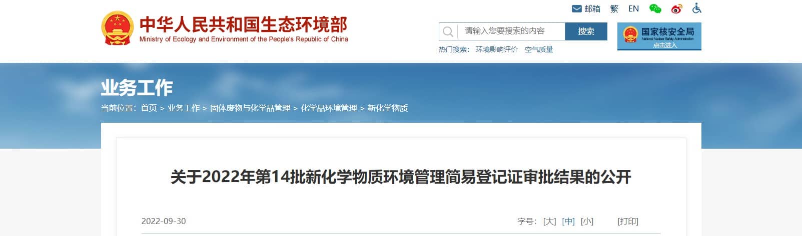 按照《中華人民共和國政府信息公開條例》(國務院令第711號)的要求,現(xiàn)將2022年第14批新化學物質環(huán)境管理簡易登記證審批結果予以公開。