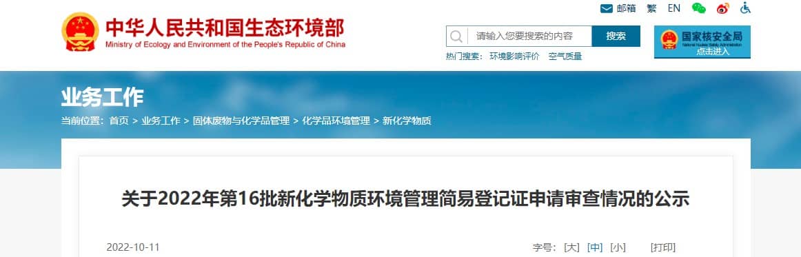 關于2022年第16批新化學物質環境管理簡易登記證申請審查情況的公示