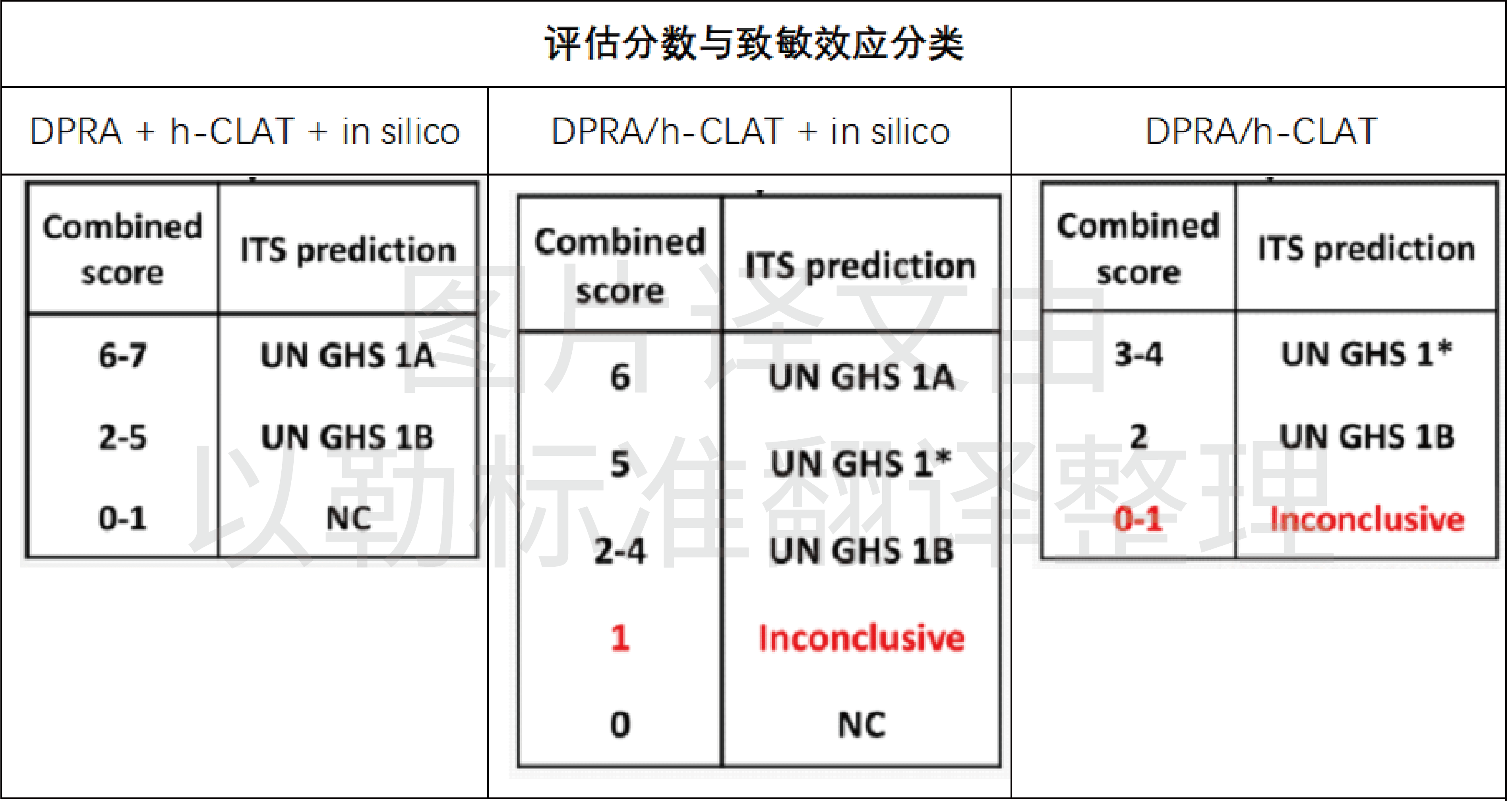 用于評估皮膚致敏性危害和效力(分GHS 1A、1B和NC,即強致敏性、中等到弱致敏性、無分類)。該策略包括導致皮膚過敏KEs中的KE1和KE3,并包括對皮膚致敏性的計算模擬預測(in silico)。使用DPRA定量評估蛋白質結合(KE1),按致敏性強弱評0-3分;h-CLAT定量評估樹突狀細胞激活(KE3),按致敏性強弱評0-3分;(Q)SAR軟件Derek Nexus(ITSv1)提供了對皮膚敏感性的計算模擬預測,按有無致敏性評0-1分。DPRA或h-CLAT其中一種方法可用時,既可進行評估,三種方法均可用時,評估結果最為可靠確切。具體分類方法如下:
