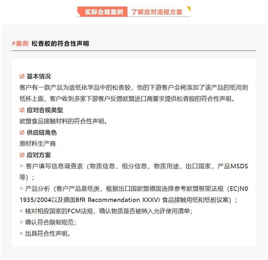 符合性聲明是上游向下游傳遞產品安全和告知下游使用限制的文件,只有供應鏈中的供應商和客戶之間開展有效的信息傳遞,才能保證食品接觸材料終產品的合規性。企業應該在產品出口到歐盟各成員國之前務必確認產品是否符合相關法規要求。