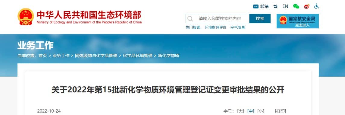 按照《中華人民共和國政府信息公開條例》(國務院令第711號)的要求,現(xiàn)將2022年第15批新化學物質環(huán)境管理登記證變更審批結果予以公開。