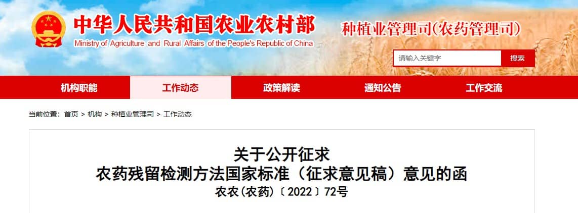 農業農村部關于公開征求農藥殘留檢測方法國家標準(征求意見稿)意見的函(農農(農藥)﹝2022﹞72號)