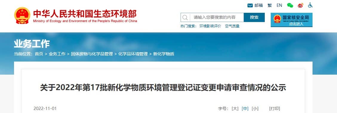 關于2022年第17批新化學物質環境管理登記證變更申請審查情況的公示