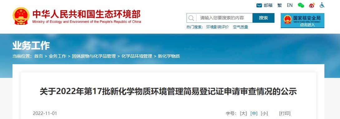 關于2022年第17批新化學物質(zhì)環(huán)境管理簡易登記證申請審查情況的公示