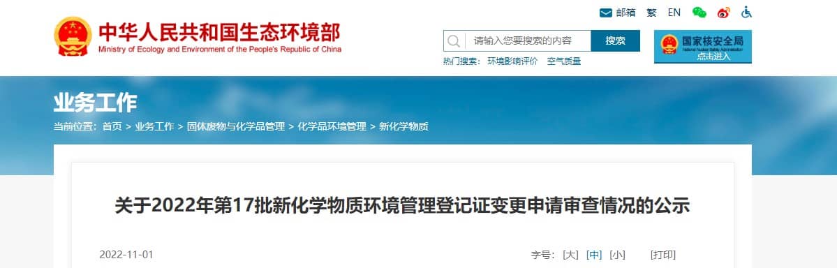 關(guān)于2022年第17批新化學(xué)物質(zhì)環(huán)境管理登記證變更申請(qǐng)審查情況的公示
