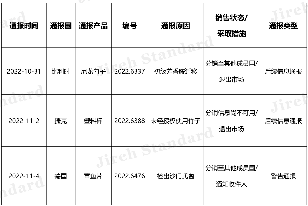 據歐盟RASFF官方網站消息,在2022年第44周通報中,歐盟食品和飼料類快速預警系統(RASFF)通報中國食品及相關產品有3例。1例是因為初級芳香胺遷移違規,1例是因為添加了未經授權的植物纖維違規,1例是檢出沙門氏菌違規。