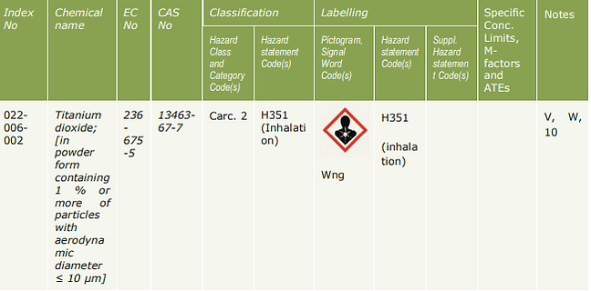 [二氧化鈦]該吸入致癌物的分類僅適用于含有1%以上二氧化鈦的粉末狀混合物,二氧化鈦以空氣動力學(xué)直徑≤10μm的顆粒形式存在或包含在其中。