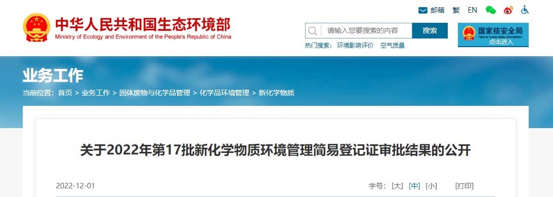 按照《中華人民共和國政府信息公開條例》(國務(wù)院令第711號(hào))的要求,現(xiàn)將2022年第17批新化學(xué)物質(zhì)環(huán)境管理簡易登記證審批結(jié)果予以公開。
