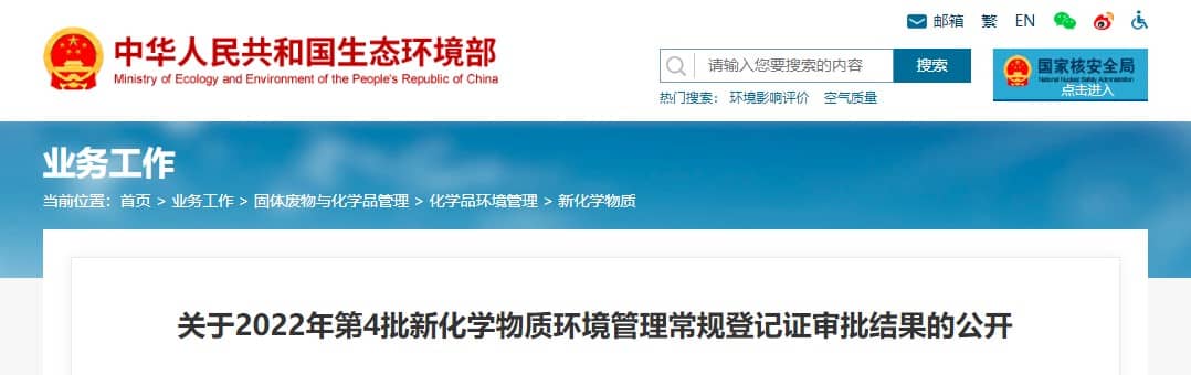 關于2022年第4批新化學物質環境管理常規登記證審批結果的公開