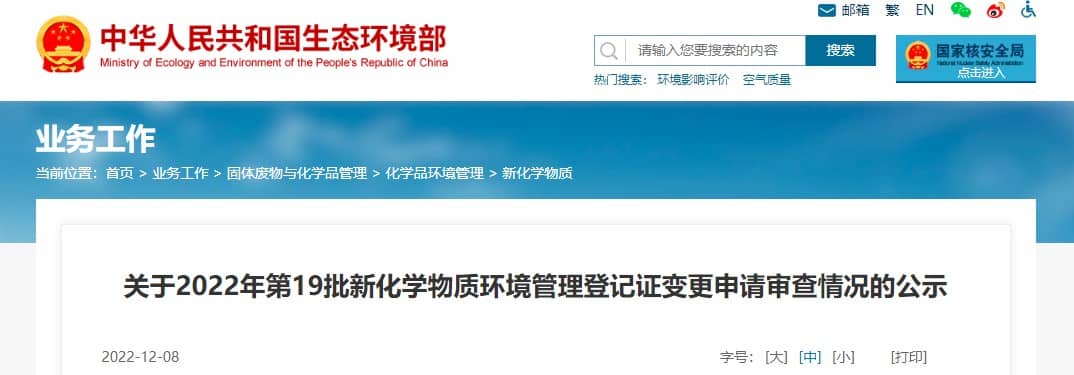關于2022年第19批新化學物質環境管理登記證變更申請審查情況的公示