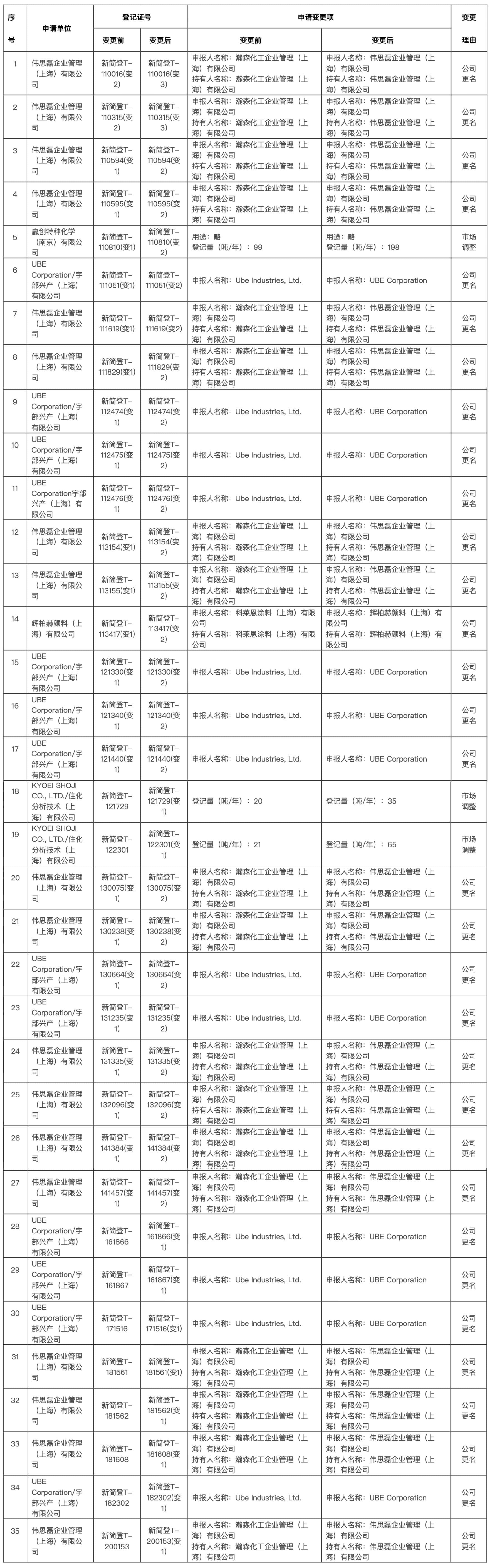 4 | MU Ionic Solutions Corporation/宇部興產(chǎn)(上海)有限公司 | 新常登C-18036 | 新常登C-18036(變1) | 申報(bào)人名稱:Ube Industries, Ltd. | 申報(bào)人名稱:MU Ionic Solutions Corporation | 公司拆分 |