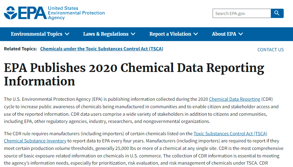 重要發布!美國EPA公布了2020年化學品數據報告CDR