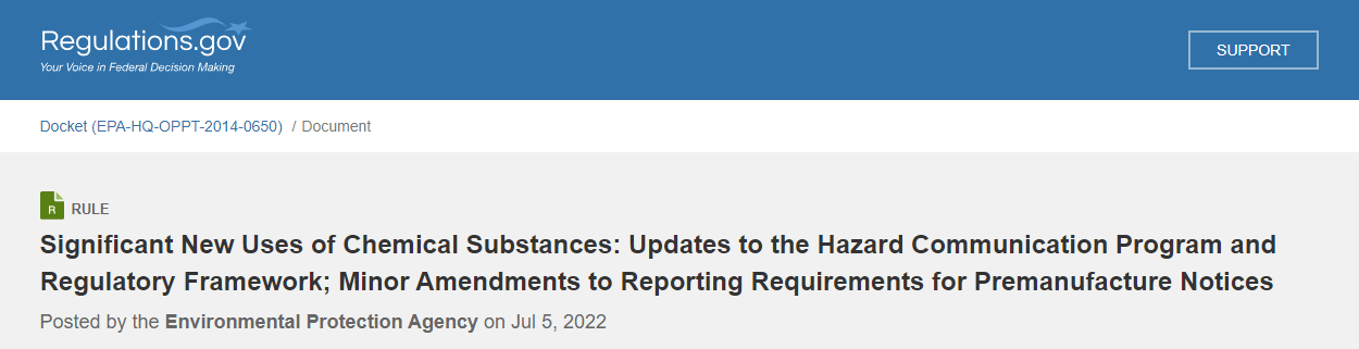 美國環(huán)境保護署(EPA)正在修訂《有毒物質(zhì)控制法案》(TSCA)下關(guān)于化學(xué)物質(zhì)重大新用途的法規(guī)規(guī)定,以符合美國職業(yè)安全與健康管理局(OSHA)對危害通識標(biāo)準(zhǔn)(HCS)的修訂,以及對OSHA呼吸保護標(biāo)準(zhǔn)和國家職業(yè)安全與健康研究所(NIOSH)呼吸保護認(rèn)證要求的更改。
