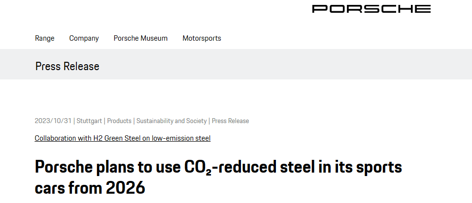 10月31日,保時捷公司和瑞典能源初創企業H2 Green Steel簽署了一份供應低碳排鋼的協議,其目標是通過使用低碳排鋼來進一步改善保時捷汽車的排放平衡。