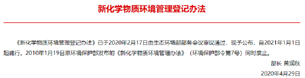 《新化學物質環境管理登記辦法》2021年1月1日起施行