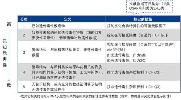 根據文獻數據庫或者QSAR計算所得出的危害評估的結果,可將雜質分為5個類別,詳細分類見下表。